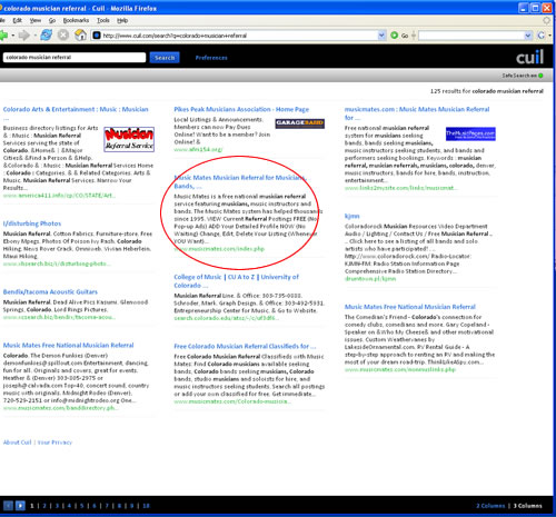 I’m going to throw my 2 cents into the ring about Cuil. First, let’s use an example to demonstrate what al the fuss is about. If I search Google for one of my websites MusicMates.com which is a national musician referral but based out of Colorado, here’s what I get:
